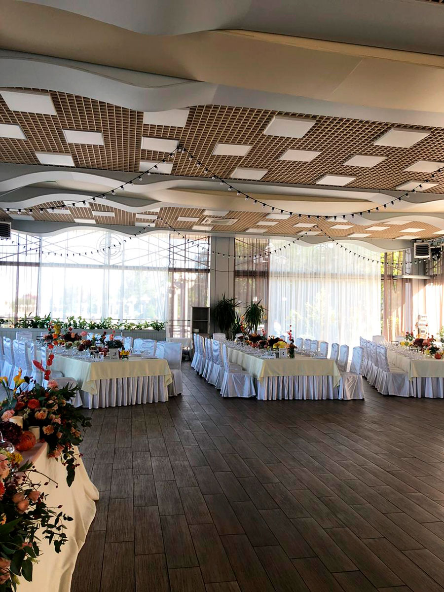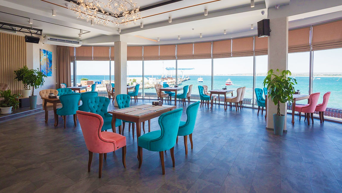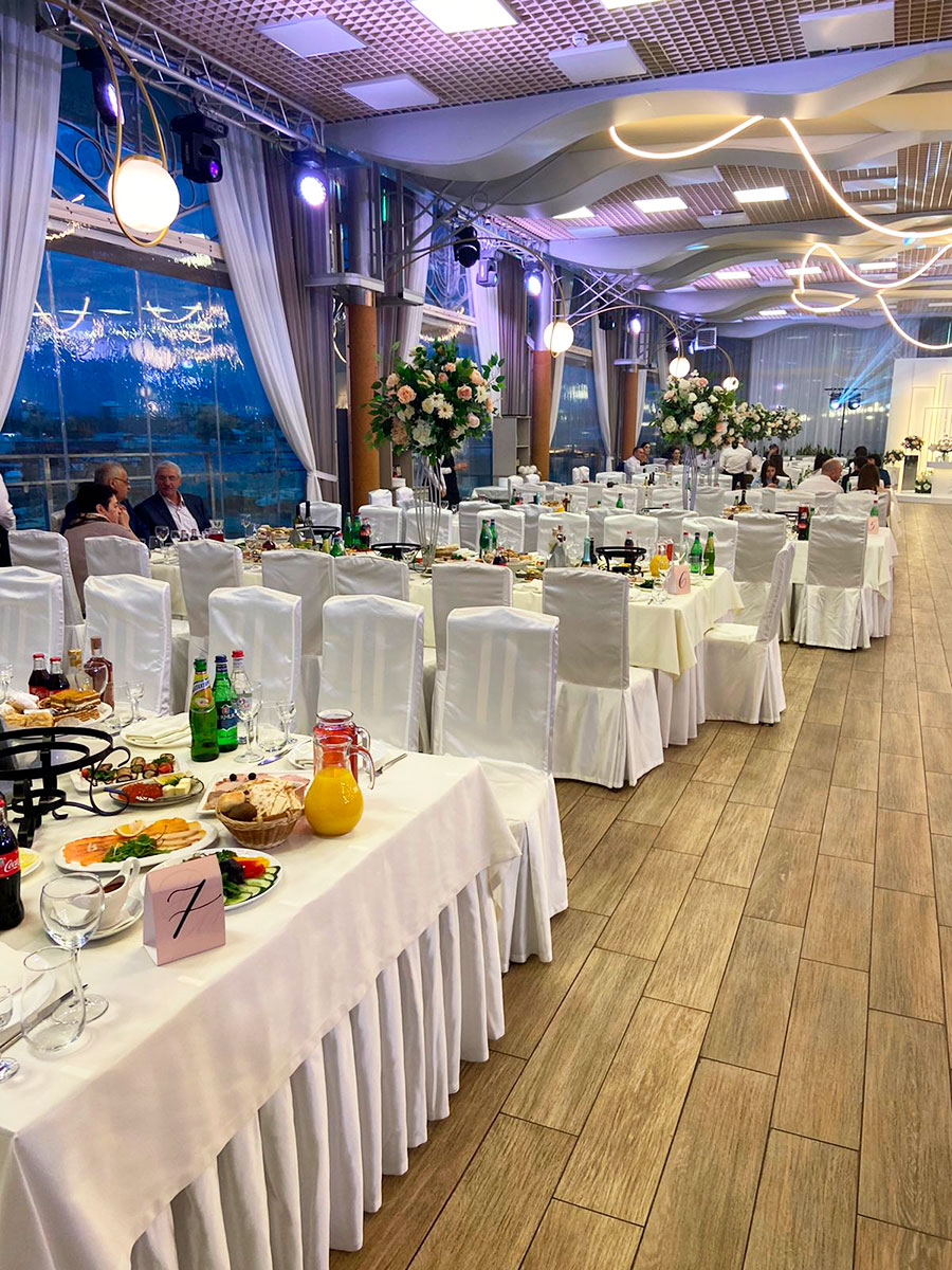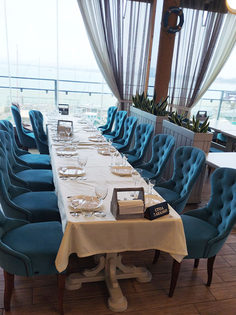 Для камерного мероприятия идеально подойдет закрытый зал на 60 персон с панорамными морскими пейзажами, а для больших компаний - общий зал на 120 мест с видом на море.