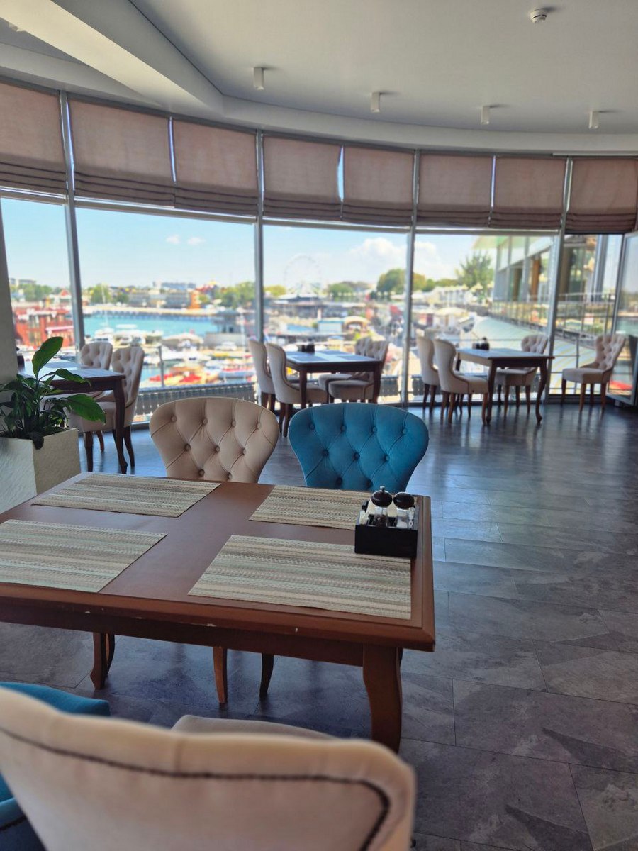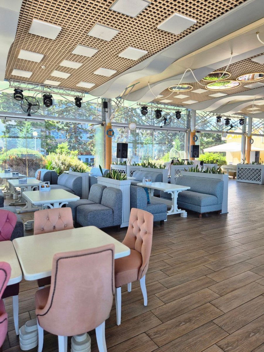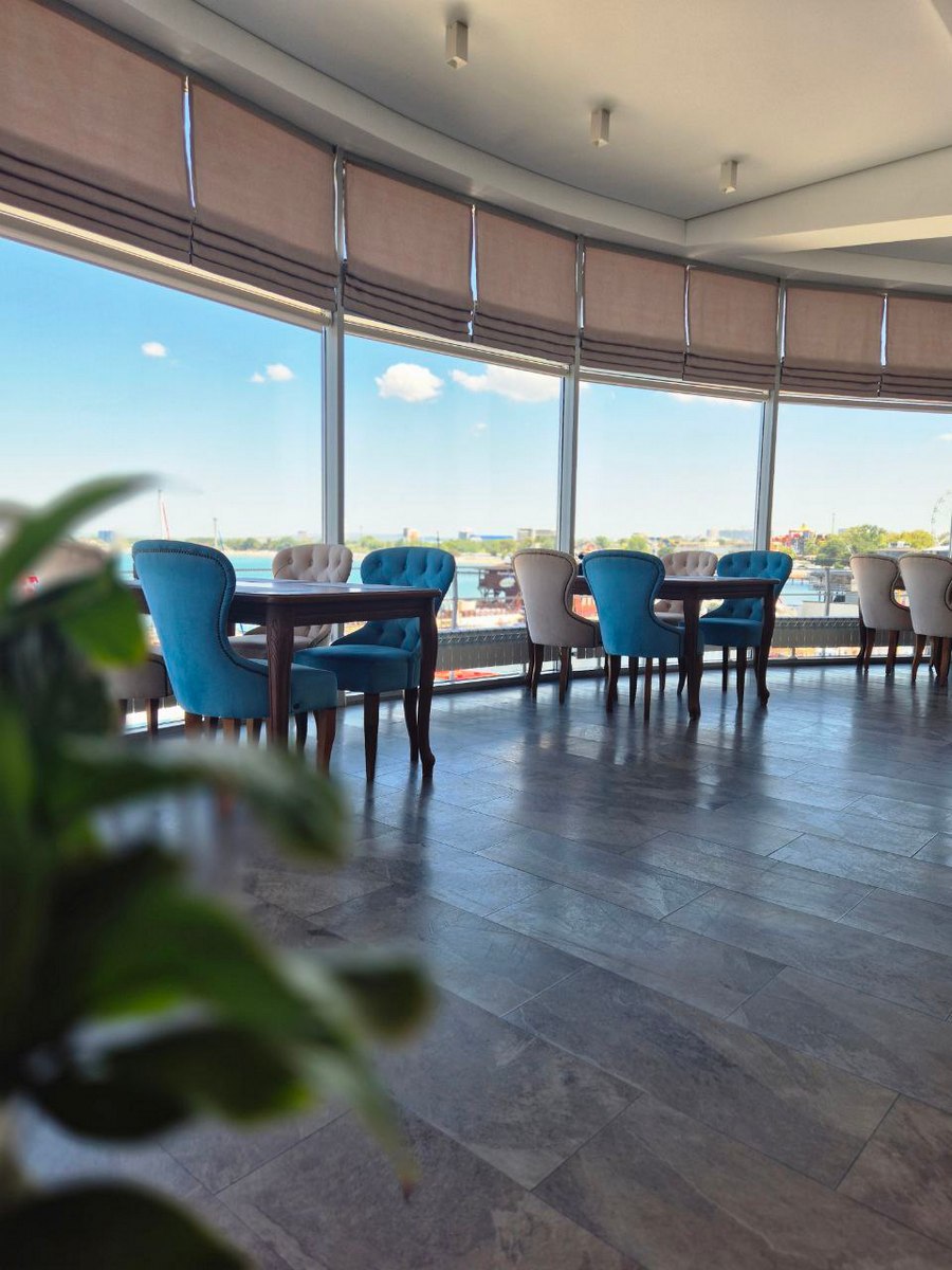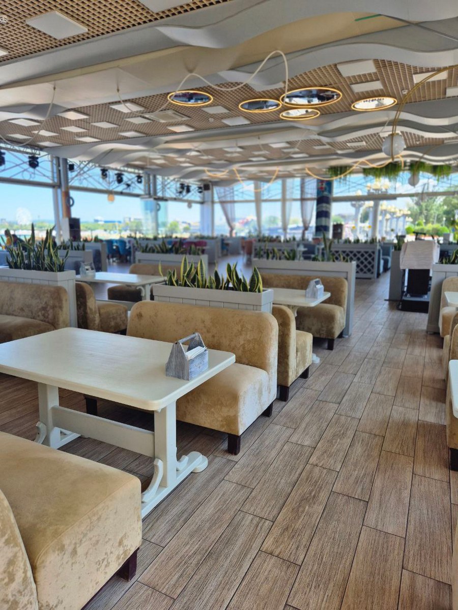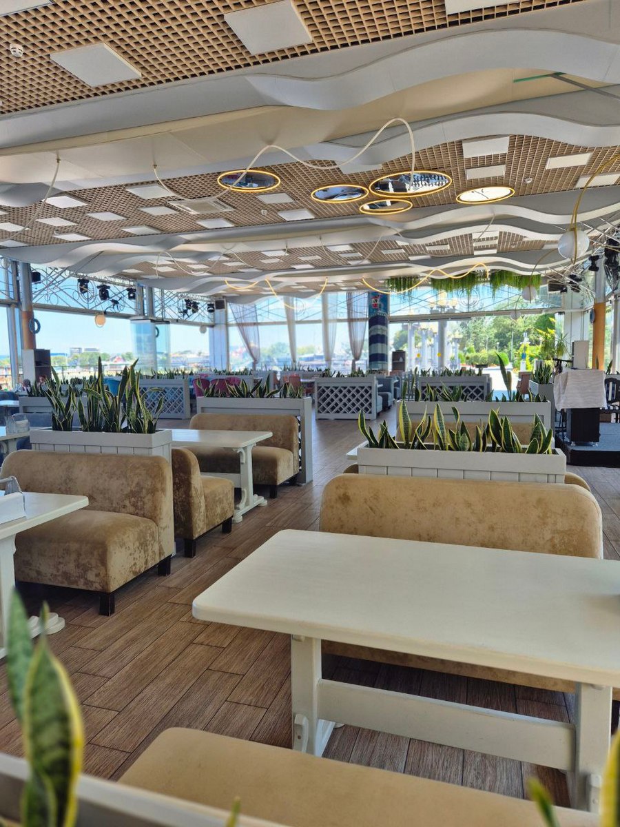 Хорошее местоположение, с красивым видом. Приятное оформление зала с мягкими диванами. Широкий выбор блюд в меню, хорошая музыка.