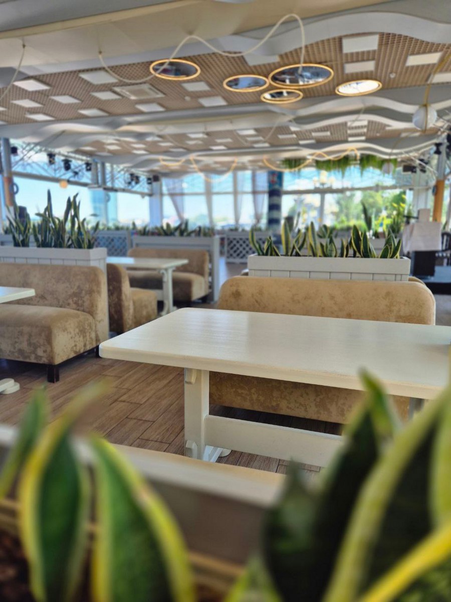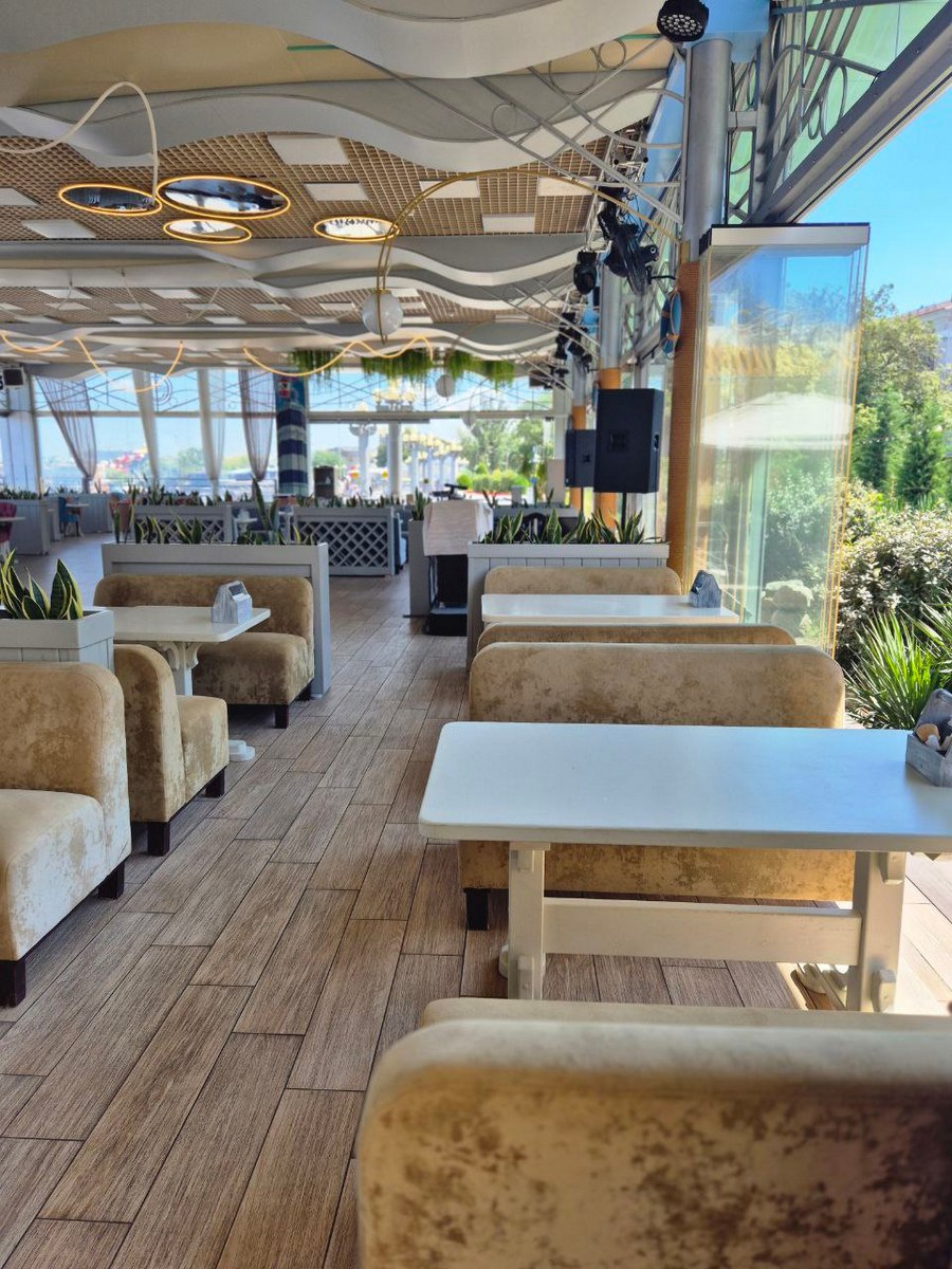 Очень красивое кафе на набережной. С шикарным панорамным видом на море. Очень красиво. Удобные мягкие диваны, живая музыка.